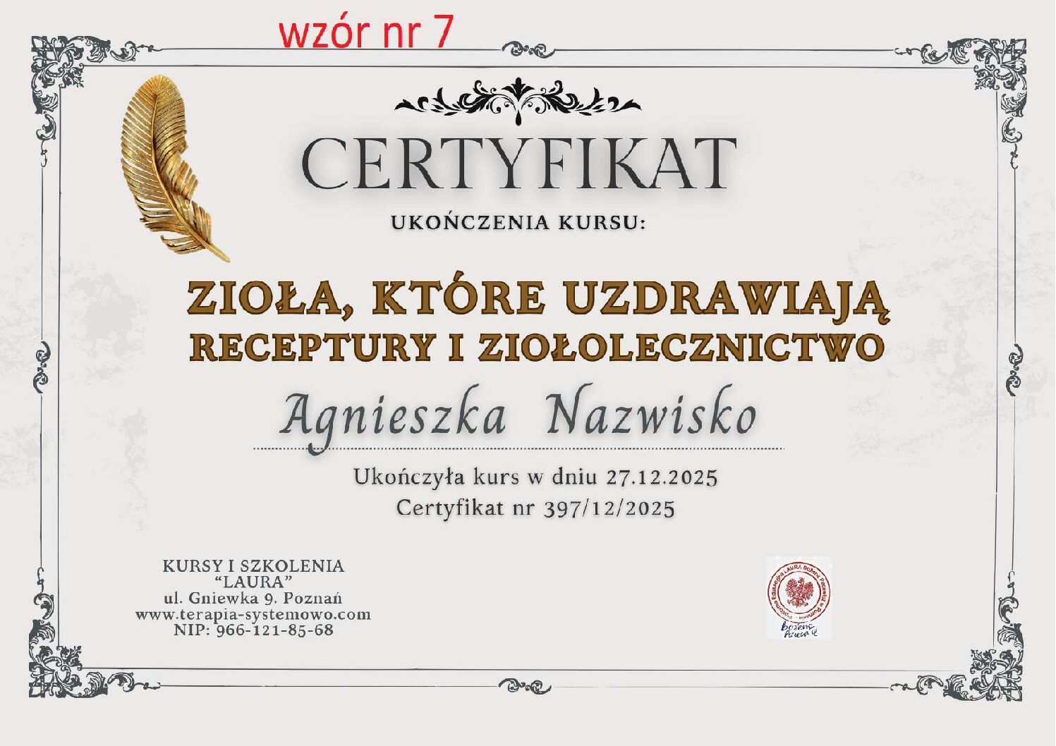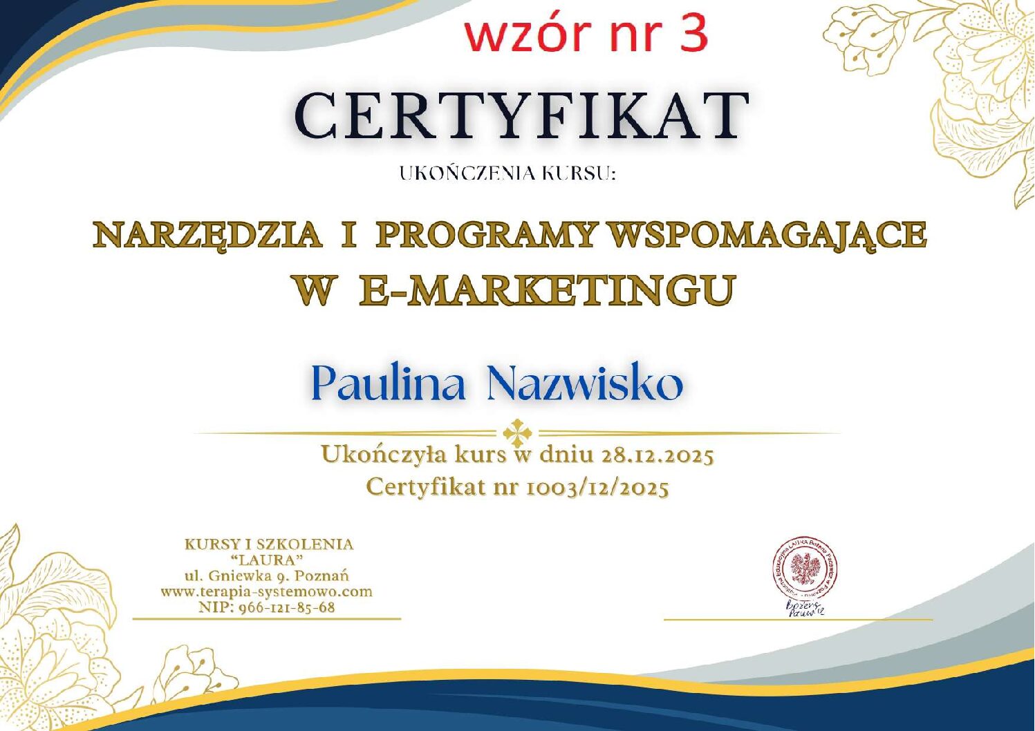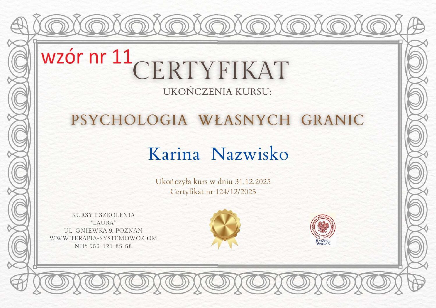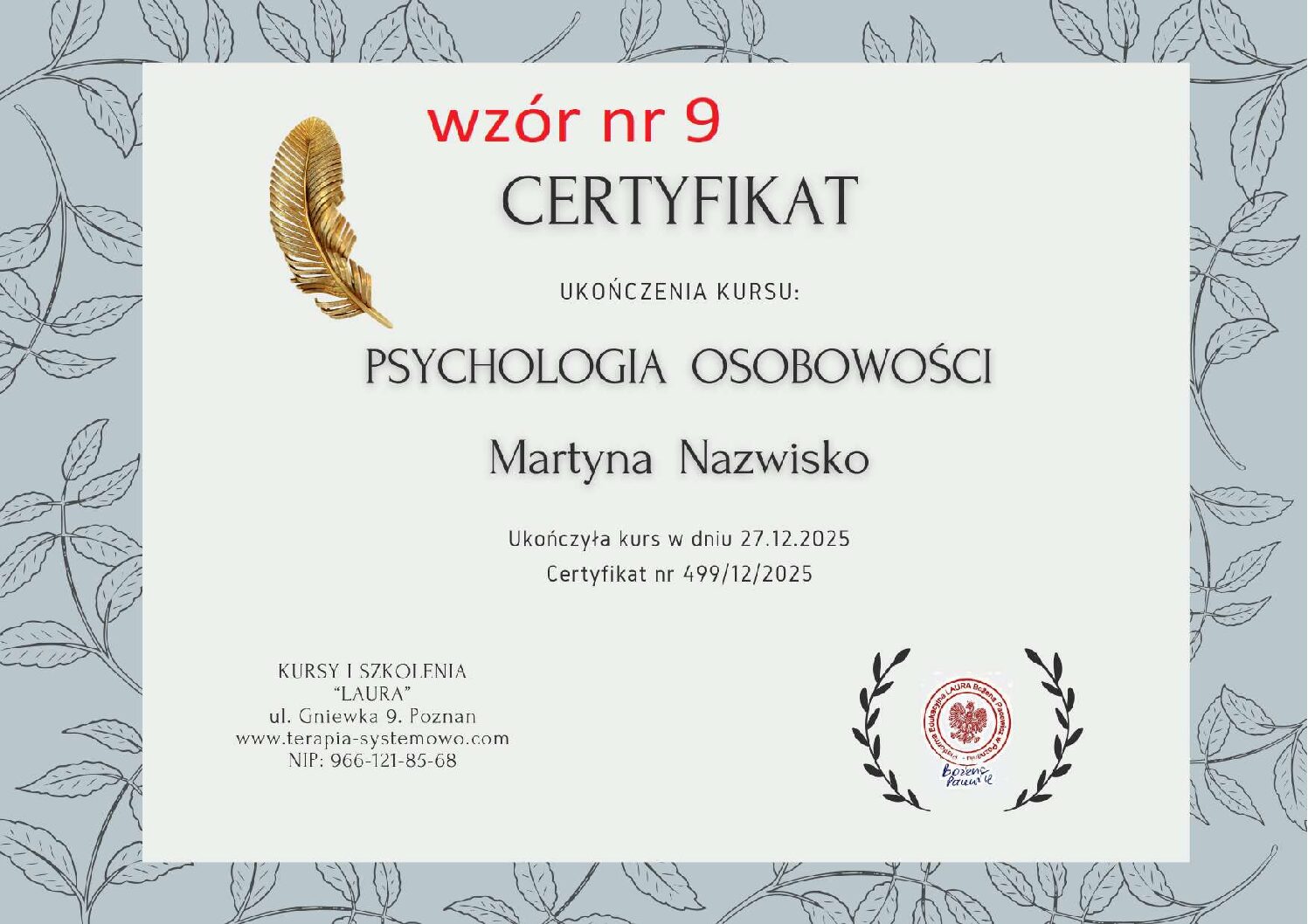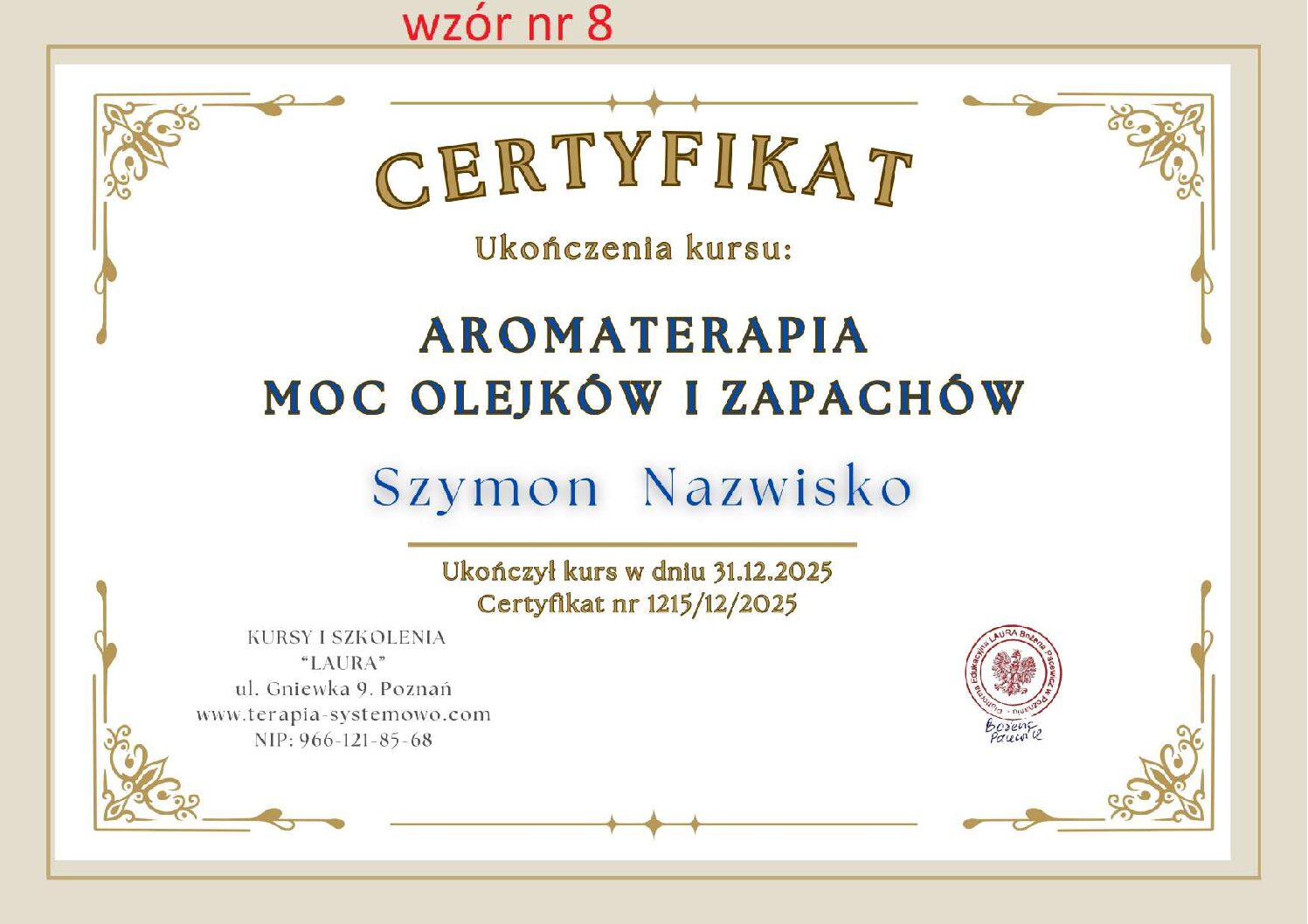 Kontaktując się z nami w sprawie wystawienia certyfikatu proszę w mailu podać numer wzoru certyfikatu, który Państwo wybierają. WZORY od 1 do 11.