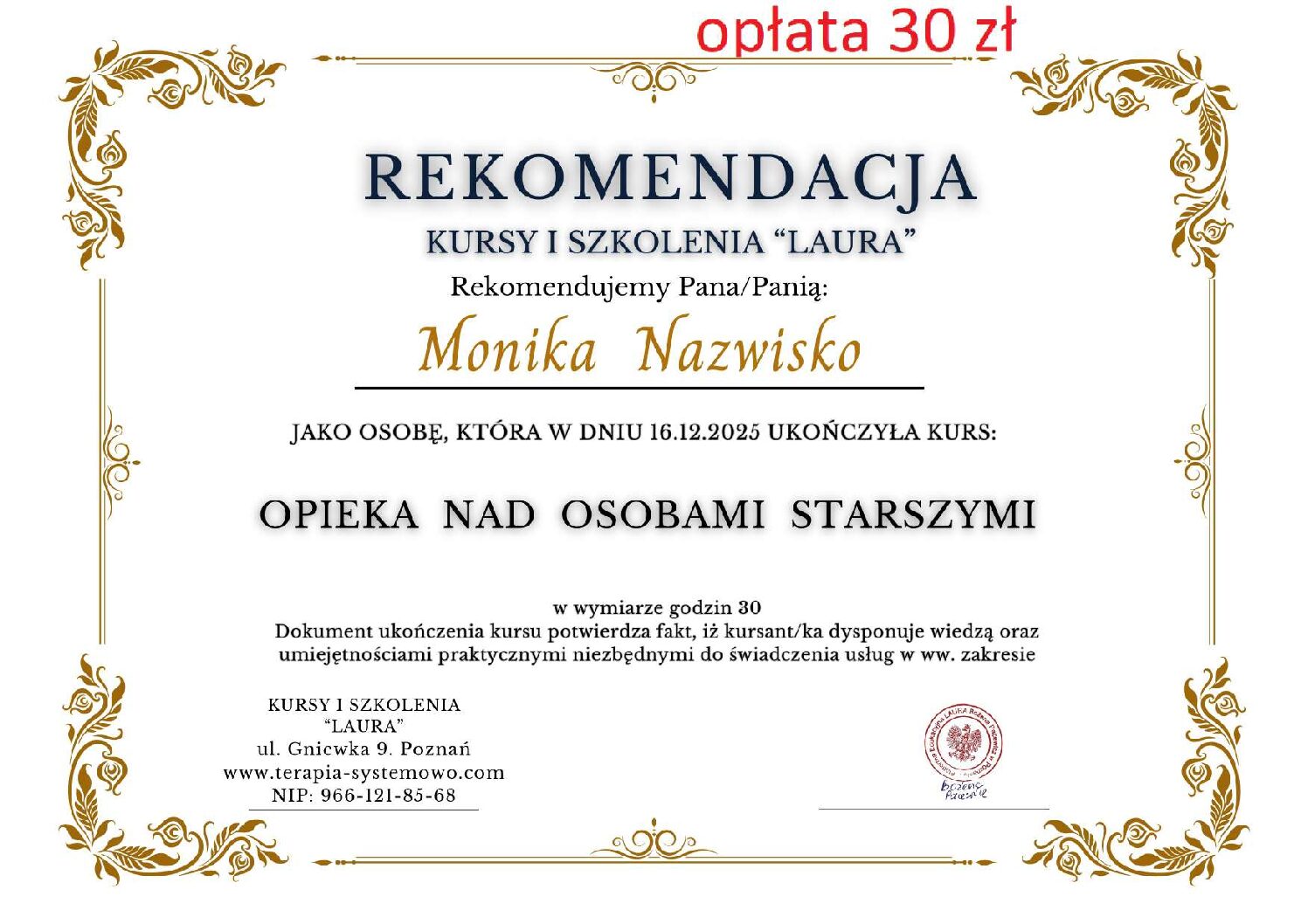 – Rekomendację w formie PDF (gotowa do wydruku), lub papierowa – wysyłana razem z certyfikatem – dodatkowo płatna 30 pln.